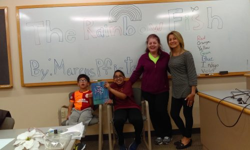 Finding science in stories is one of the strategies used in Gateway to Science, followed up with an activity to reinforce the science. Here The Rainbow Fish was read at the 2017 South Shore Science Festival by volunteers Denise Duncan and JoJo Foley. Bruno Barroso and Nandan Nair approved! Other times, Deputy Dan and the Bank Robbers offered lots of jumping activities, and Curious George at the Aquarium offered throwing activities to learn about energy v. gravity. Kathy Hogan photo